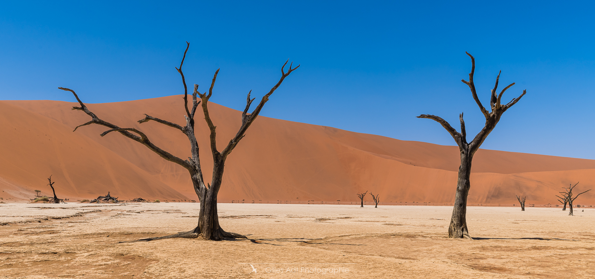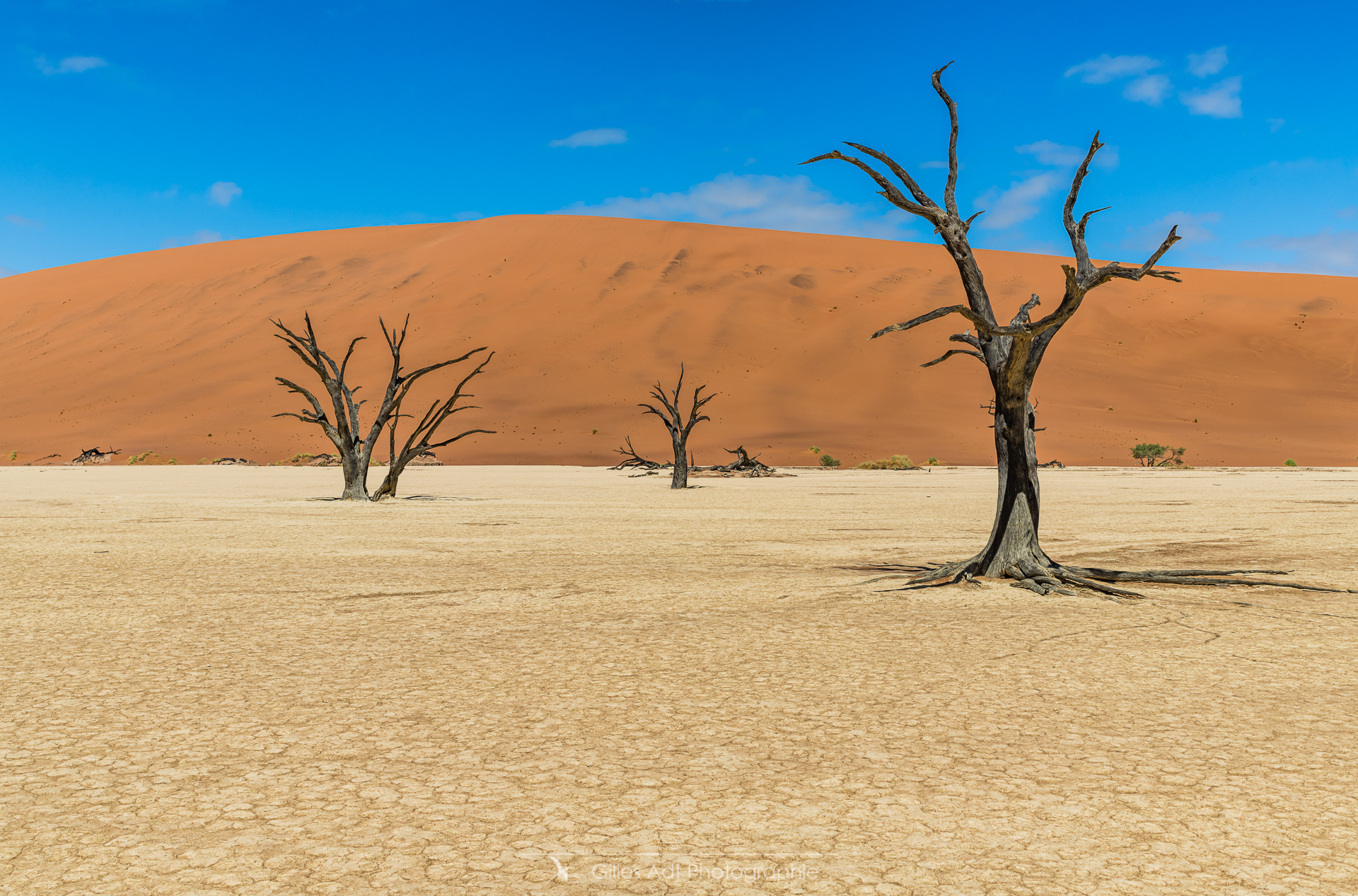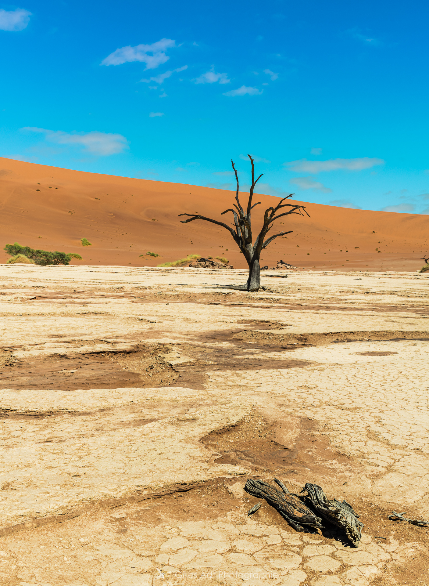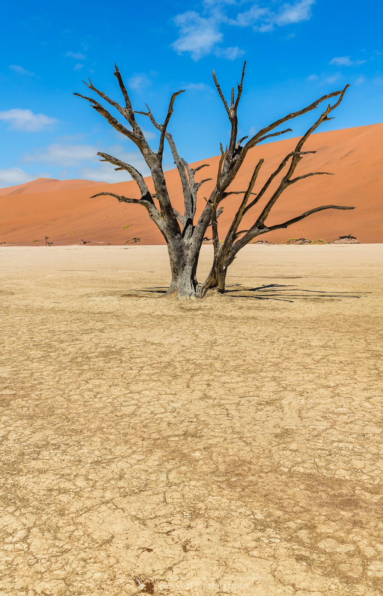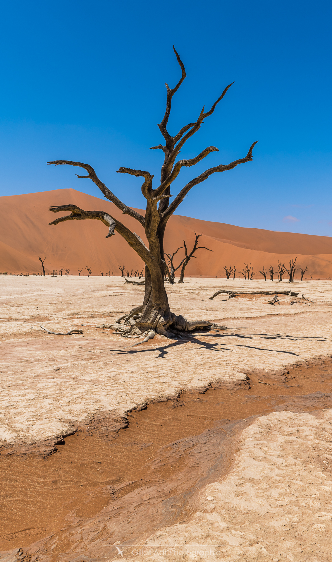 le Ded Vlei (ce qui signifie « le marais mort ») est une cuvette entourée des dunes les plus élevées du monde. Les acacias du désert qui parsèment ce lieu sont morts depuis 900 ans. Les acacias et Big Daddy Vue d’ensemble du Dead Vlei Acacias du désert Forêt pétrifiée Un acacia du désert Argile et acacia Bois mort Barrières de dunes La dune Big Daddy (350m) Solitaire pétrifié Les 3 frères La sentinelle Acacias, argile et dunes Acacia pétrifié Erosion
