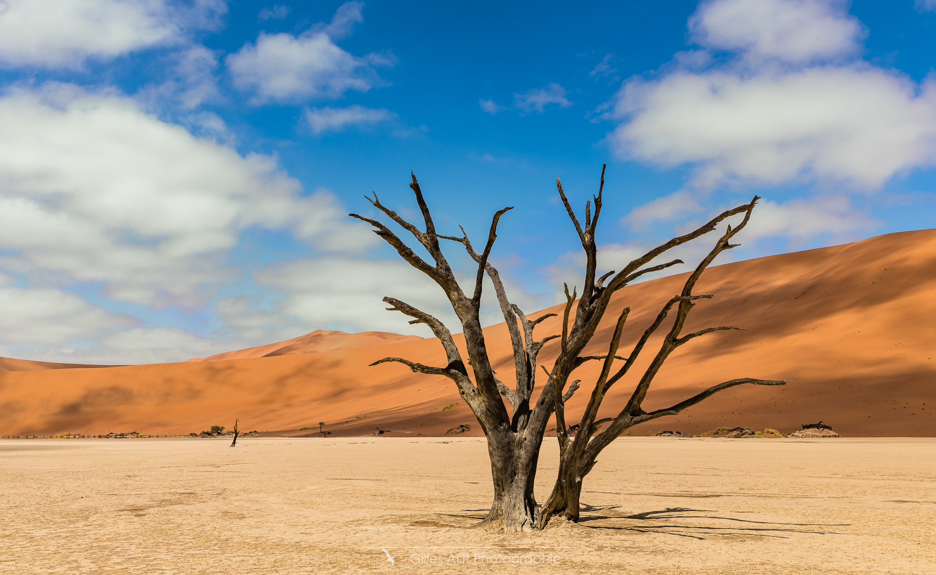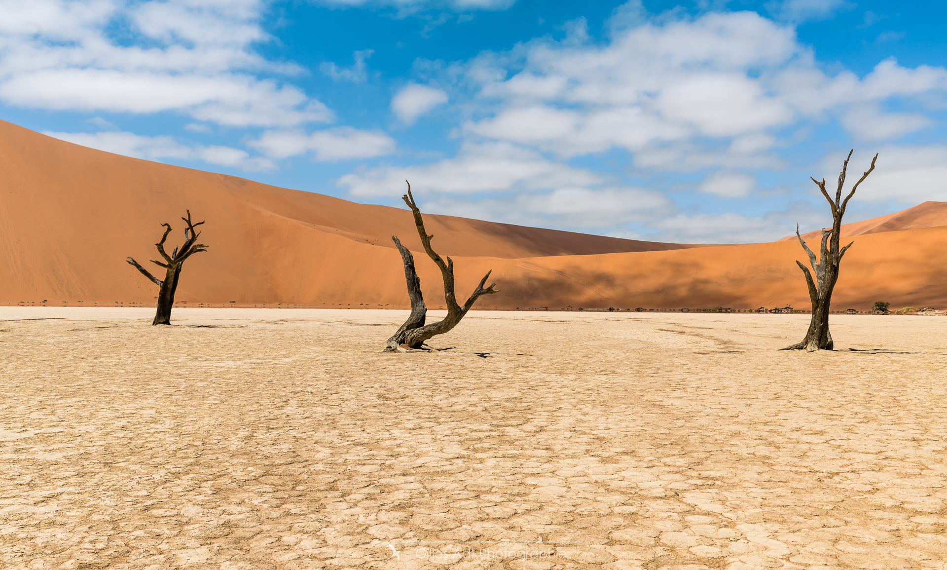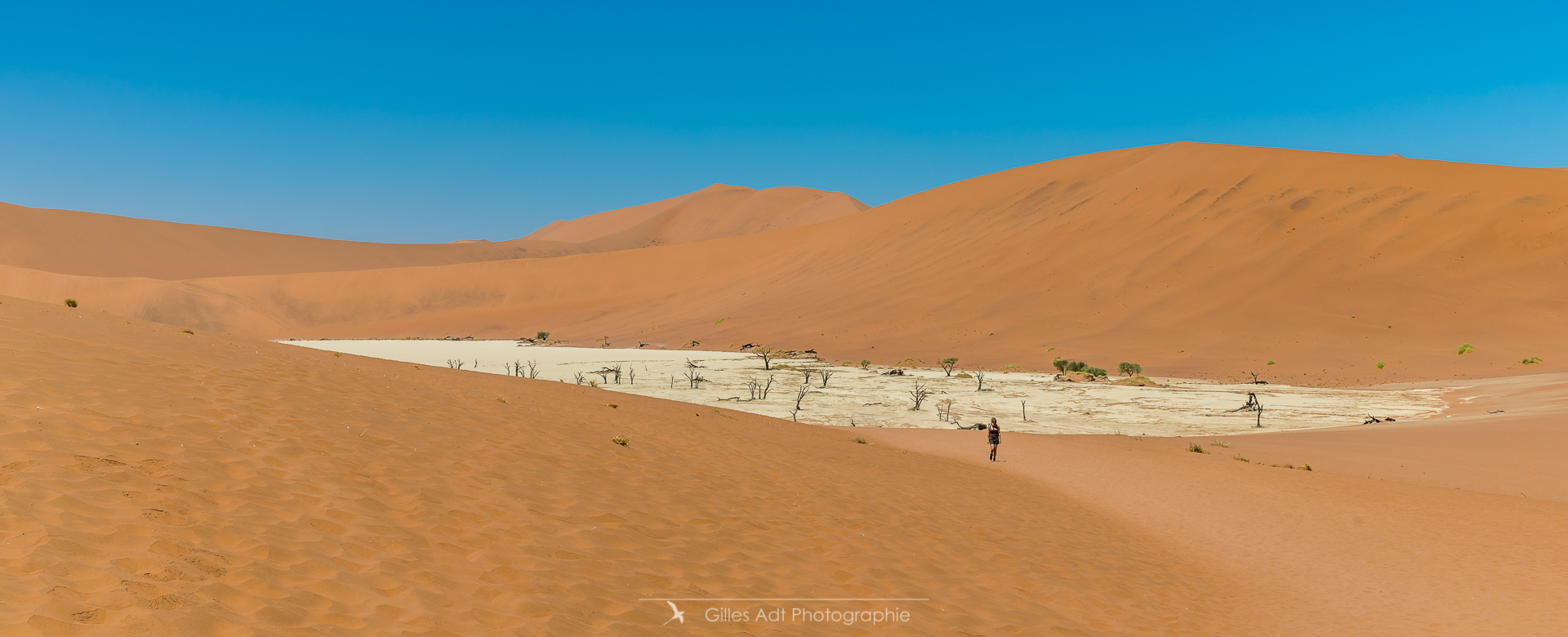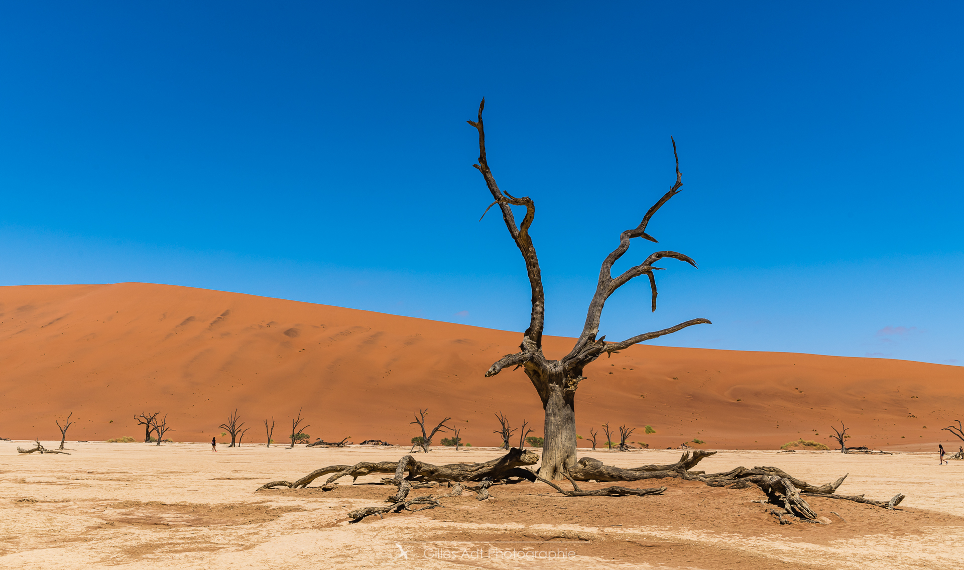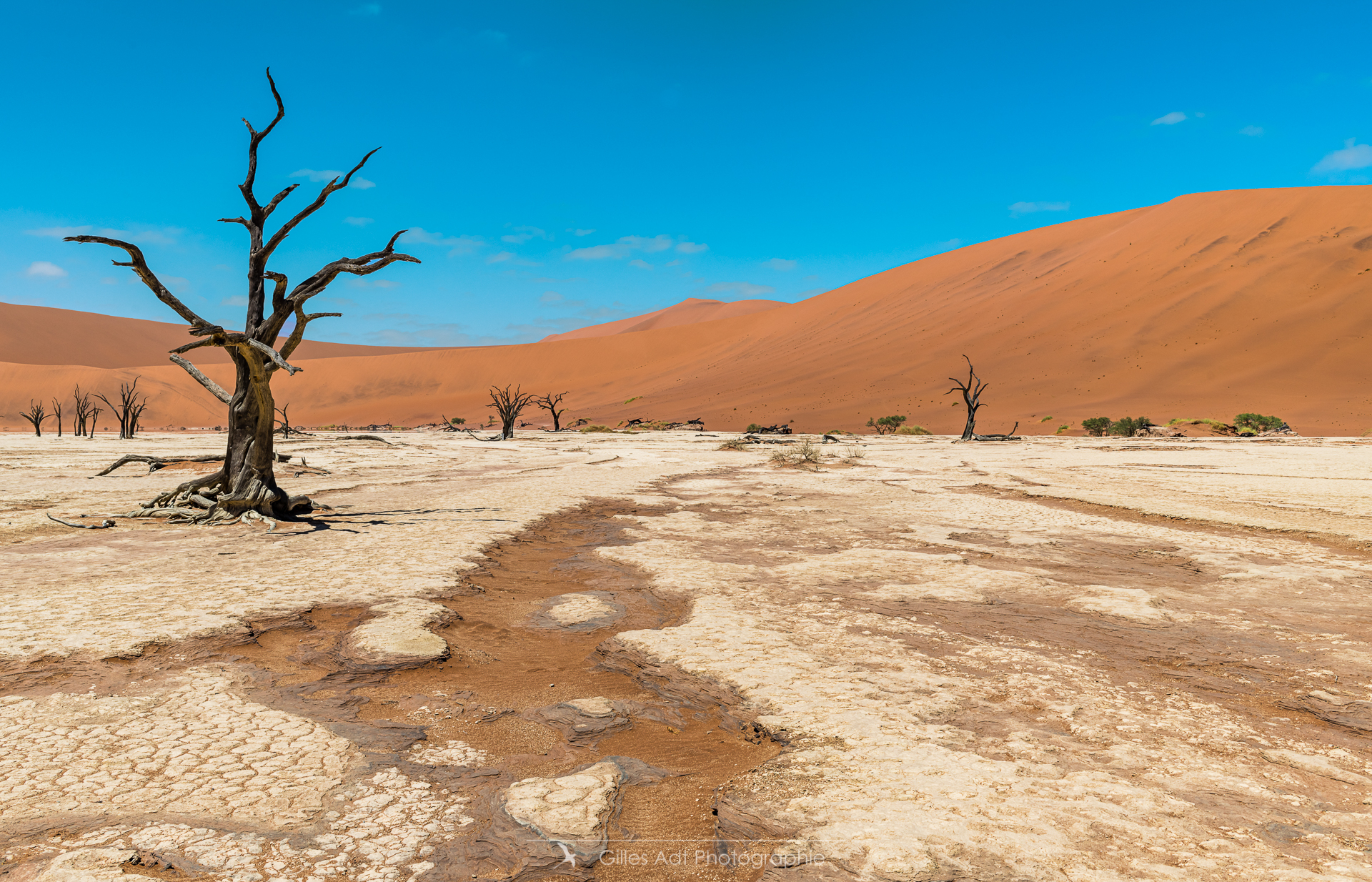 le Ded Vlei (ce qui signifie « le marais mort ») est une cuvette entourée des dunes les plus élevées du monde. Les acacias du désert qui parsèment ce lieu sont morts depuis 900 ans. Les acacias et Big Daddy Vue d’ensemble du Dead Vlei Acacias du désert Forêt pétrifiée Un acacia du désert Argile et acacia Bois mort Barrières de dunes La dune Big Daddy (350m) Solitaire pétrifié Les 3 frères La sentinelle Acacias, argile et dunes Acacia pétrifié Erosion